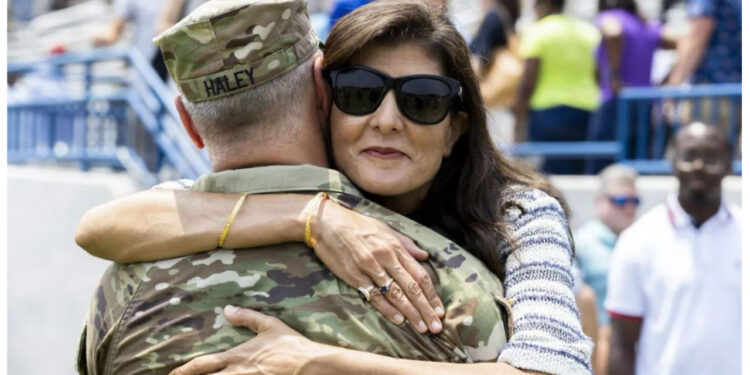 Haley bid her husband goodbye at a ceremony held at The Citadel, a military college in Charleston, in June 2023. His deployment occurred at the peak of her GOP presidential campaign, which she withdrew from last month.