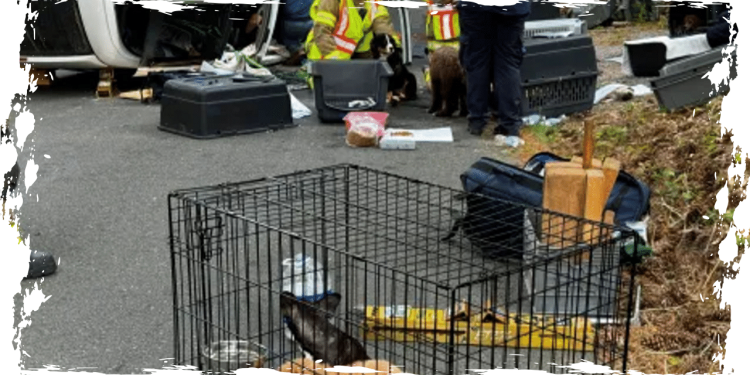 According to fire officials, a minivan carrying multiple breeds of dogs was involved in an accident early in the morning in Woodstock, a rural town adjacent to Massachusetts. The dogs were in crates in the back of the vehicle at the time of the crash. Although electrical wires fell onto the van, fortunately, no injuries were reported.
