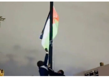 A video shows police officers pulling down a Palestinian flag and replacing it with an American flag after clearing up...