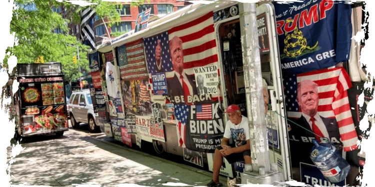 A couple who made a living selling merchandise supporting Donald Trump out of a bus adorned with pro-Trump flags and posters have found themselves without a home after their vehicle collided with multiple street signs and utility poles in New York City.