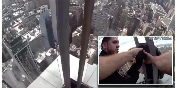 Heart-pounding footage shows highly trained NYPD officers climbing over a glass wall to save a terrified woman on the brink of a 54-story rooftop in Manhattan last week.
