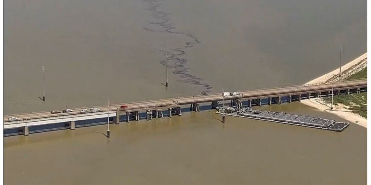 Galveston bridge collapses after barge collision, leading to oil spill in the water