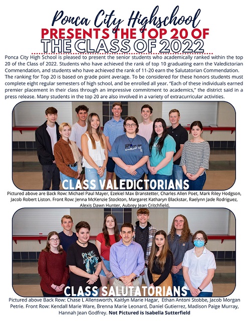 Ponca City High School announces the top 20 of the Class of 2022!!