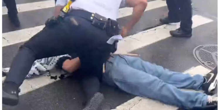 Disturbing footage shows New York Police Department officers pushing a pro-Gaza protester to the ground, appearing to hit him repeatedly.