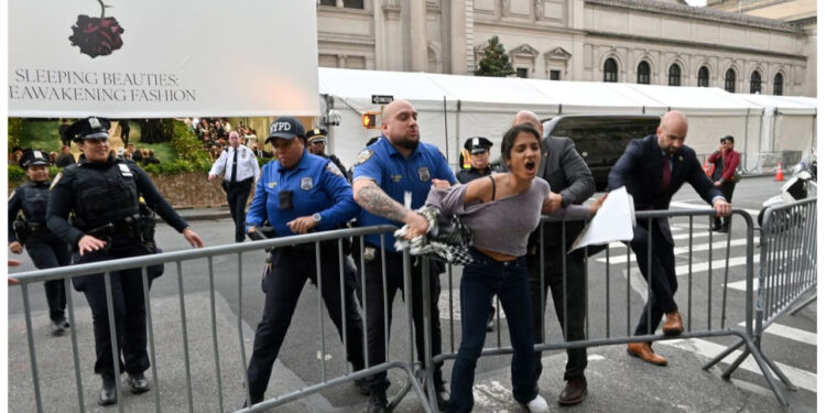 As the largest number of demonstrators made their way up Fifth Avenue, nearing the museum’s red carpet, they evaded and broke through police barriers. Later, demonstrators on Park Avenue detonated pink and green smoke bombs, as well as at least one flare, sparking shouts from Upper East Side residents filming on the sidelines.