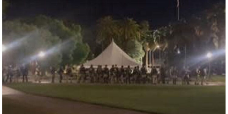 Around 4 a.m., officers in riot gear formed a line surrounding the tent encampment. Their presence was evident as they proceeded to dismantle tables and tents from within the encampment.