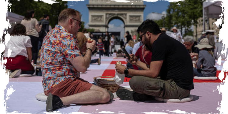Around 4,000 people gathered on the iconic Champs-Élysées in Paris, turning the renowned street into a sprawling picnic area. Bathed in warm sunlight, they savored their meal outdoors, creating a vibrant and relaxed atmosphere.