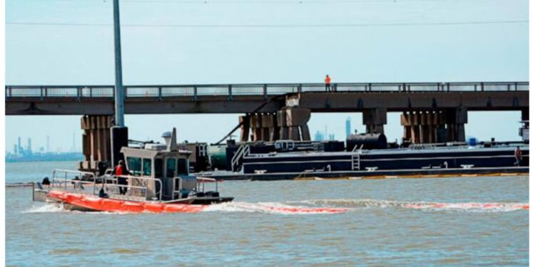 The 321-foot barge, MMLP 321, collided with a pillar on the railroad portion of the Pelican Island Causeway on Wednesday morning, causing oil aboard the vessel to flow into Galveston Bay, officials said. The span is the only bridge connecting Galveston, Texas, to nearby Pelican Island.