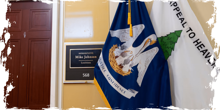 House Speaker Mike Johnson proudly showcases the flag in the hallway outside his office, alongside the Louisiana state flag. According to him, he has been flying it “for as long as he can remember.”