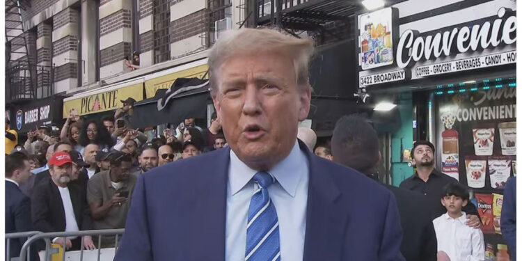 During a press discussion at the Harlem bodega later on Tuesday, Trump once again voiced his unfounded criticism that keeping him off the trail is an act of “election interference.”