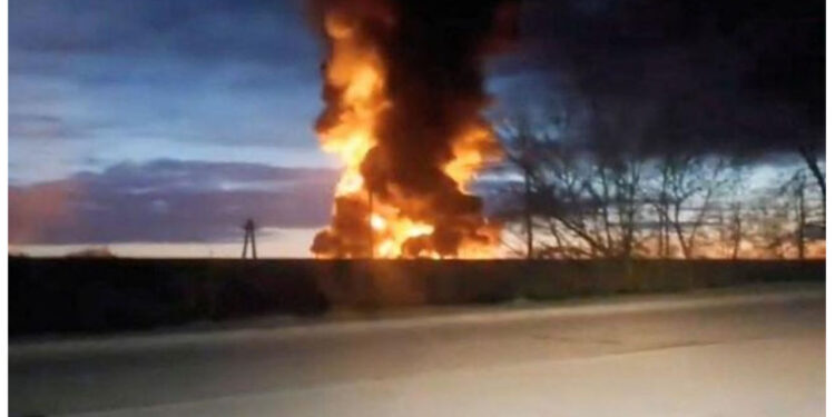 Videos circulating on social media display massive fires and thick black smoke billowing from what appears to be two oil storage tanks at one of the facilities situated west of Moscow, near the borders with Belarus and Ukraine.